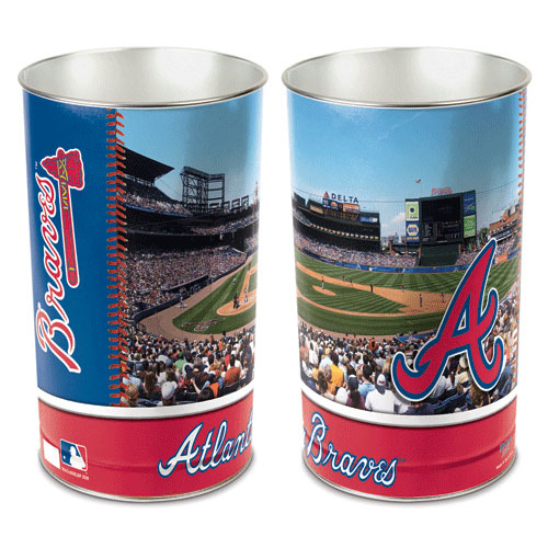 Officially licensed Atlanta Braves wastebasket. These metal wastebaskets are a great way to decorate a room or office. Wastebaskets are 15"" tall by 10.25"" diameter and are tapered for easier storage/display and shipping. Made in USA.