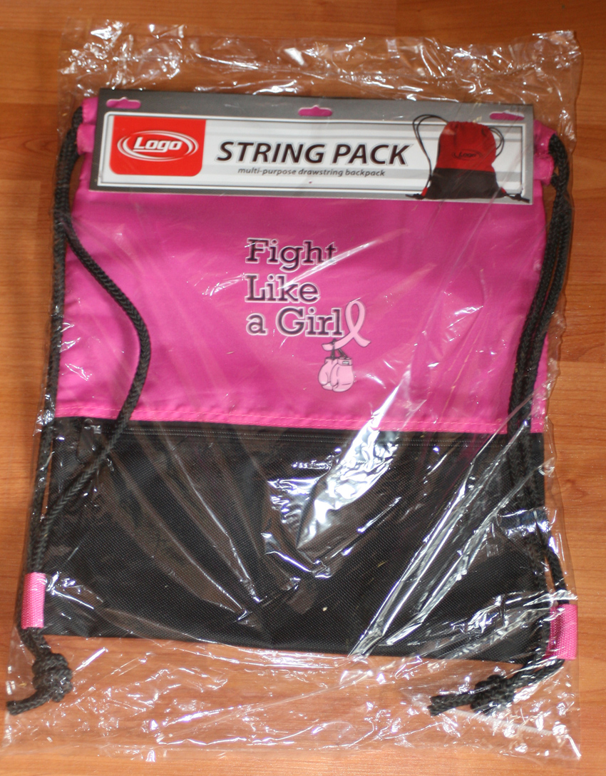 Has drawstring for shoulder straps and a screen printed Fight Like A Girl logo on the front.