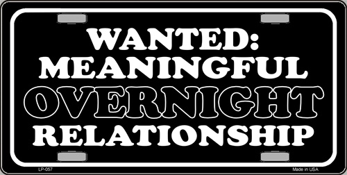 This "Wanted: Meaningful Overnight Relationship" license plate is made with the highest quality embossed aluminum thats available today! Lightweight and Durable – these tags are identical in quality to the state issued license plates we all are required to have on our vehicles. All License Plates are standard size 6" x 12" to accomodate any and all vehicles.