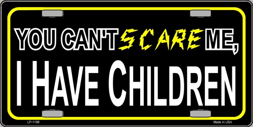 This You Can't Scare Me, I Have Children License Plate is made with the highest quality embossed aluminum thats available today! Lightweight and Durable – these tags are identical in quality to the state issued license plates we all are required to have on our vehicles. All License Plates are standard size 6" x 12" to accomodate any and all vehicles.