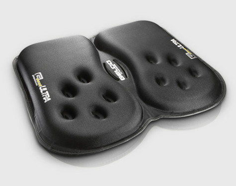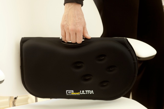 GSeat Gel Cushion G-Seat ULTRA Comfort Seat. G-Seat ULTRA Wheelchair Gel Cushion. The GSeat ULTRA is larger and is the the newest G-Seat available. Perfectly suited for any wheelchair, scooter or power chair application with it's thicker design. The G Seat ULTRA is comfortable in any situation. Even ergonomically engineered chairs do not address the point of contact, which is where pressure is concentrated as your body sits on a chair. This leads to discomfort and fatigue. The GSeat ULTRA uses visco-elastic gel and functional design to disperse pressure and improve your level of comfort anywhere you sit.incorporates the premier material in gel technology, which maintains its shape and cushioning properties better than any polymers and foams currently on the market. It provides relief from the stressful affects of being seated for long periods of time, like low back pain and stiffness and numbness in the lower legs. The integrated handle makes the GSeat ULTRA conveniently portable. By using superior materials and functional design, GSeat has developed the premier product for seated comfort.The GSeat ULTRA is ergonomically engineered to enhance comfort while seated. It slopes forward 5 degrees to return your pelvis to it's proper position, reducing lower back strain and maintaining proper lumbar curvature. Dynamic Density Technology combines the benefits of gel and memory foam to create a lightweight cushion that provides superior comfort. The Integrate Handle and foldable design is patented technology that makes the GSeat ULTRA conveniently portable.