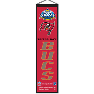 Designed on Winning Streak Sports high quality wool fabric with embroidery and applique these 8" x 32" vertical banners showcase each Super Bowl Champion by featuring the official Super Bowl logo, team logo and the final score. Also included are a rod and cord for easy display.