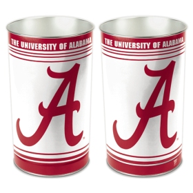 Officially licensed Alabama Crimson Tide wastebasket. These metal wastebaskets are a great way to decorate a room or office. Wastebaskets are 15"" tall by 10.25"" diameter and are tapered for easier storage/display and shipping. Made in USA.